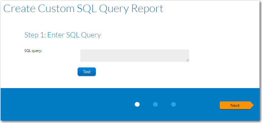 1. In the navigation bar, click Create Custom SQL Query Report on the Reports menu. The Step 1: Enter SQL Query panel of the Create Custom SQL Query Report page opens.