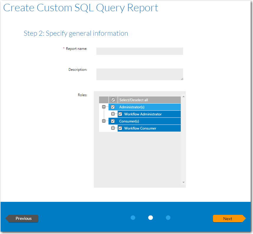 2. Enter a Report name and Description to clearly identify the contents and purpose of this report. This name and description will be listed on the All Reports page.
