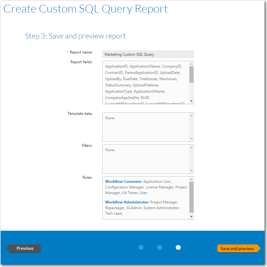 4. Click Next. The Step 3: Save and preview report page opens, which displays all the information needed to create the report.