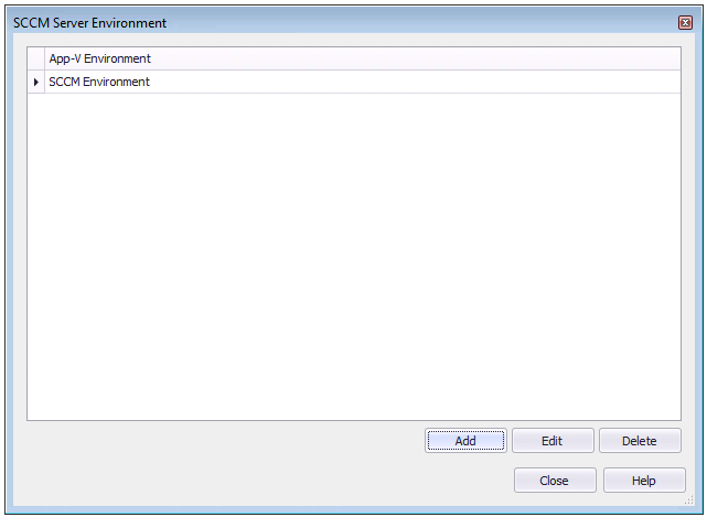 3. Click App-V Virtual Environments in the ribbon and then select SCCM Server Environment. The SCCM Server Environment dialog box opens, listing any defined App-V virtual environments.