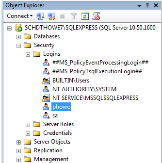 2. In the Object Explorer, open the Security > Logins node and right-click on the user account or user group that you want to assign permissions to.