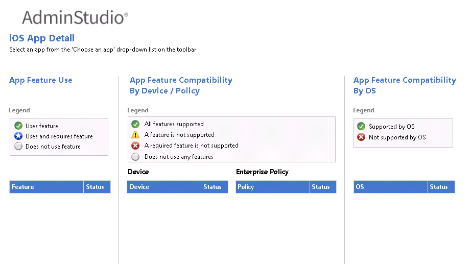 iOS/Android App DetailsProvides a combined view of the results of the analysis of feature use, feature compatibility with devices, and OS compatibility. Select the app to view by making a selection from the Choose an app list in the toolbar.