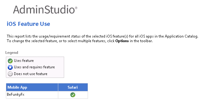 iOS/Android App Feature UseThe summary report lists the features that are being used by mobile apps in the Application Catalog and indicates the percentage of those apps that consider each feature to be either optional or required. Click on a bar segment to open more detailed reports. On Feature Use detail reports, you can select the feature that you want to view by clicking Options in the toolbar and making a selection from the list.