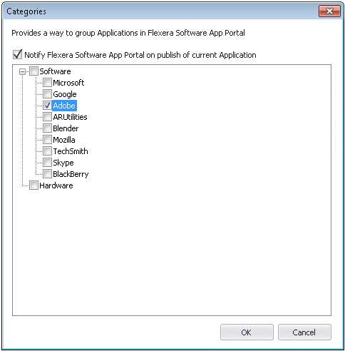 On the Categories dialog box, which is opened by clicking the browse button in the Categories field on the App Portal Information tab of the Application View, you can specify whether to create an App Portal catalog item when this application is published to System Center 2012 Configuration Manager or Symantec Altiris Server, and you can also specify the category or categories that you want the application’s catalog item to be placed in.