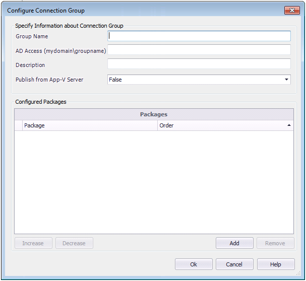 | Increase Descrease | The order of packages in the connection group is important. This determines the order in which the package contents are merged. So, if there was a conflict (example: same registry value), the content of the first package would be used. Use the Increase and Decrease buttons to change the order of the selected package. |