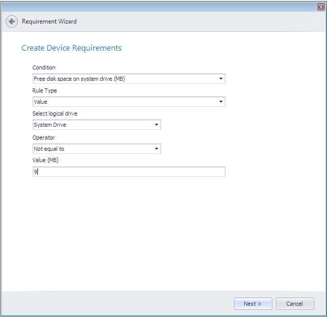 [Additional Fields]Additional fields are displayed depending upon the Condition selected. Use these fields to define the requirement for the selected Condition . Active Directory Site—Click the Add button and add a site to the Active Directory Sites list. Co-Managed Device - Click the Add button and specify a valid operator and value. Configuration Manager Site—Click the Add button and add a site to the Configuration Manager Sites list. CPU Speed (MHz)—Enter a value, in MHz, in the Value (MHz) text field. Disk space—Select a drive from the Select logical drive list and enter a value, in MBs, in the Value (MB) text box. InTune O365 Pro Plus Management - Click the Add button and specify a valid operator and value. Number of processors—Enter a number in the Value text box. Operating system—Select operating systems from the Select Operating System list. You can choose just a major category (such as Windows 8 or Windows Server 2012 ) or you can identify a specific operating system / service pack / processor type combination, such as All Windows 8 (32-bit) . Operating system language—Select languages from the Select Operating System Language(s) list. Organizational unit (OU)—Click the Add button and add a OU to the list. Total physical memory (MB)—Enter a value, in MBs in the Value (MB) text box. Windows Store inactive—Enter a value in the Value text box.