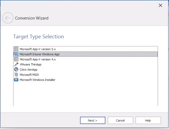 1. On the Application Manager Home tab, right-click on a Windows Installer package, PowerShell-wrapped package, or legacy installer (or a group containing packages of that type) in the tree and select Launch Conversion Wizard from the shortcut menu. The Target Type Selection panel opens. ![](/images/Microsoft Intune wizard_1.png)