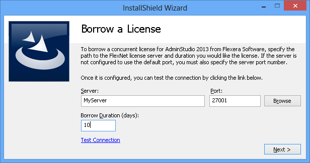 If you need to be disconnected from the same network as the FlexNet Licensing Server, you can (while you are connected to the same network) borrow the license of AdminStudio for a specified number of days. Once you have borrowed the license, you can use the product while being disconnected from the network.